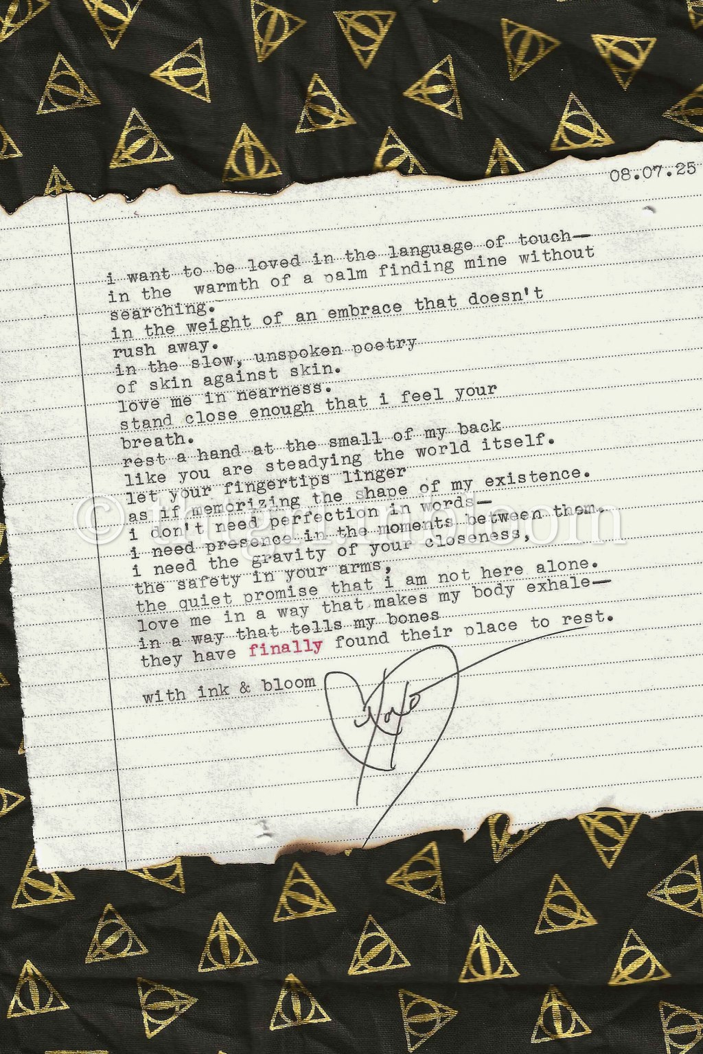 and when the world grows unbearably loud, when my chest feels like it’s carrying the heavy, slow-turning orbit of every season at once, it is your touch that becomes my compass—finding me in the dark, pulling me back toward the steady ground of your presence. it is the grounding hum of skin against skin, the way your warmth seeps into my cold edges until i am no longer afraid of the winter in me. love is not always spoken aloud. sometimes it is written in the language of touch—a language my soul has always known, a language i will spend my whole life fluent in, crafting its sentences across your skin, writing and rewriting its verses in the quiet hours, until there is no doubt, only the steady truth that i am here, and i am yours.
