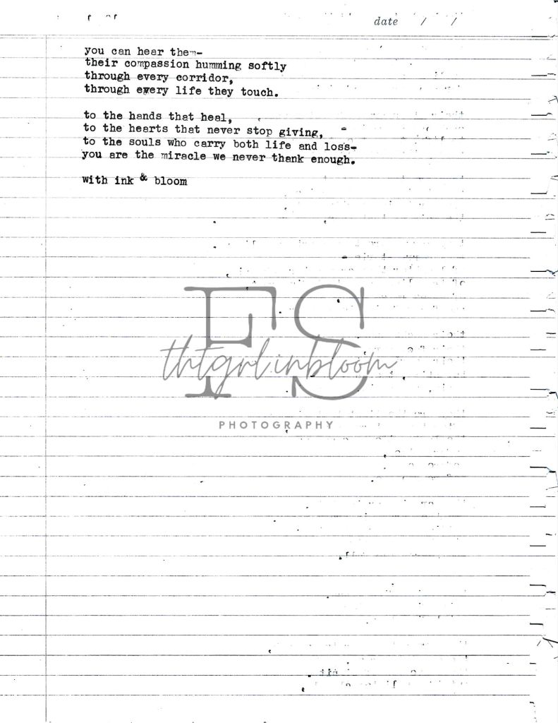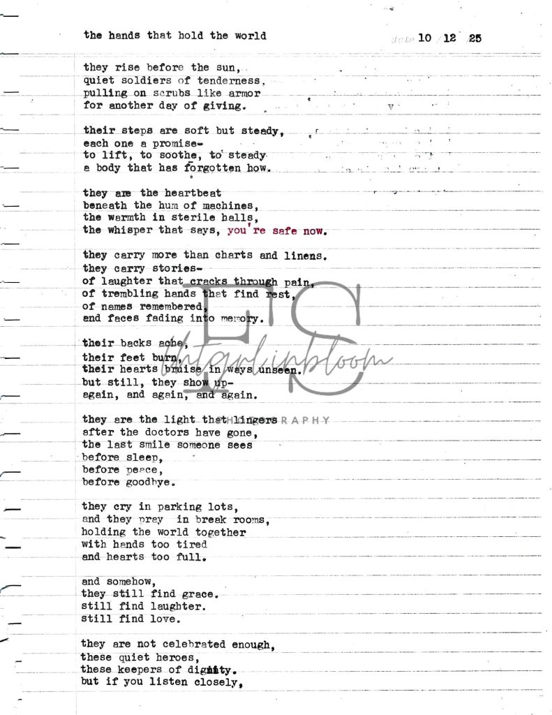 thank you for the countless invisible acts of kindness—holding trembling hands, fixing blankets, brushing hair from someone’s forehead, offering reassurance when no one else could. thank you for keeping your heart open in a job that could easily make it close.